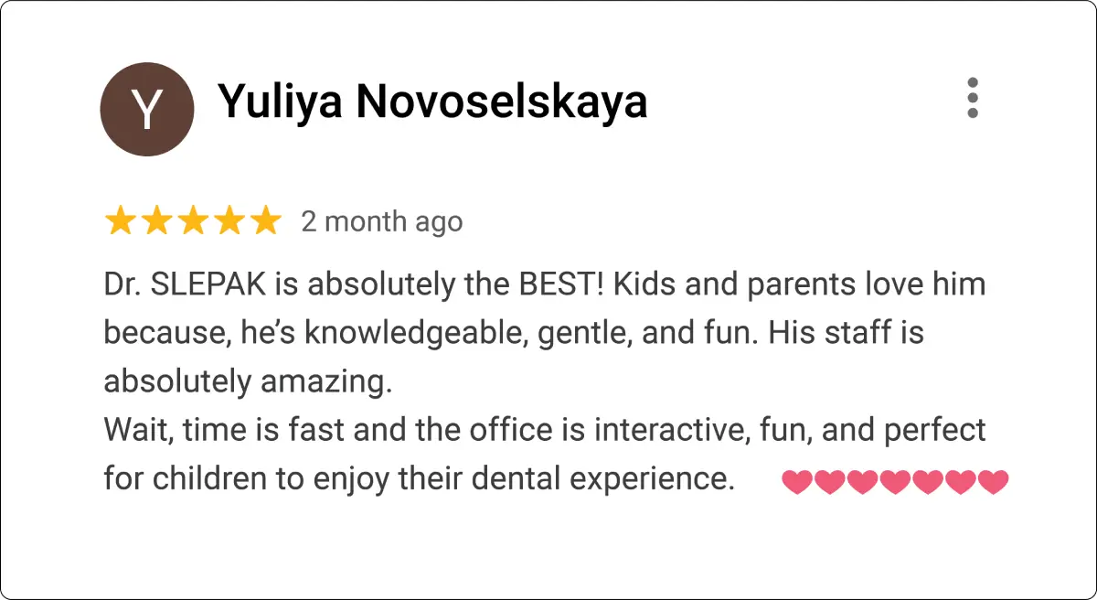 Dr. Slepak is pediatric dentist with over a decade of experience. Immediately following his graduation from the New York University College of Dentistry with Honors, Dr. Slepak continued his training at Maimonides Medical Center in the Pediatric Dentistry Residency Program.
